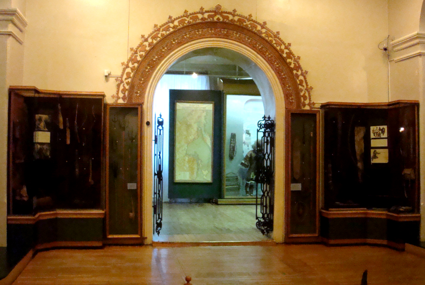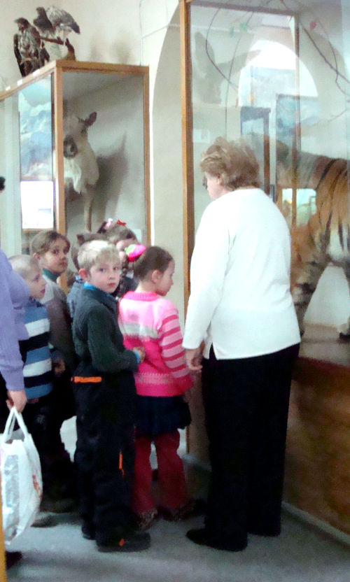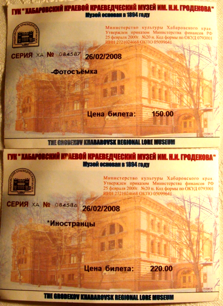 Pas grand monde dehors. Le tramway n’ayant plus de secret pour moi, direction le musée, en bordure de l’Amour. L’accueil est très chaleureux, la caissière découpe avec un soin un peu lent, mais précis, à l’aide d’un double décimètre, mes deux tickets, celui qui vaut pour ma personne, celui qui vaut pour ma boîte à savon photographique. Elle a un chapeau de fourrure blanche en forme de kokochnik - cette forme typiquement russe qui coiffe les églises et donne grâce aux fenêtres anciennes.